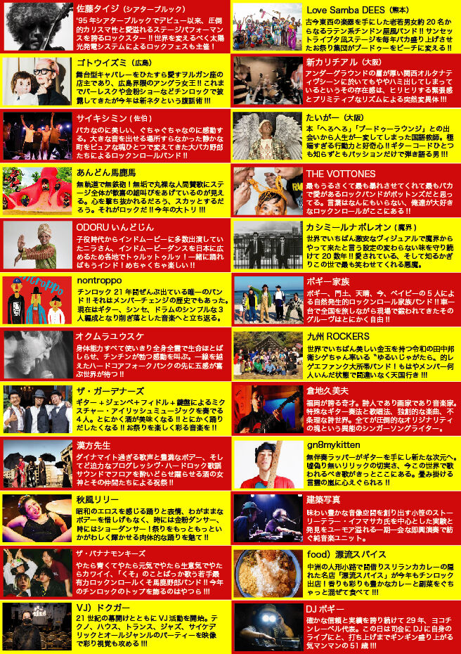 ● ヨコチンレーベルが1年で最も熱くクレイジーに燃え上がる日!!俺たちが欲しいもの。もっと人間の根源に訴える祭りを!!もっともっと生命ほとばしる歓喜の祭りを!!理屈はいらない。アホなくらい面白い音楽がある祭り「ヨコチンロックカーニバル」!!!!!